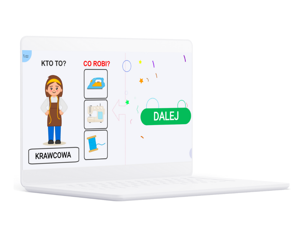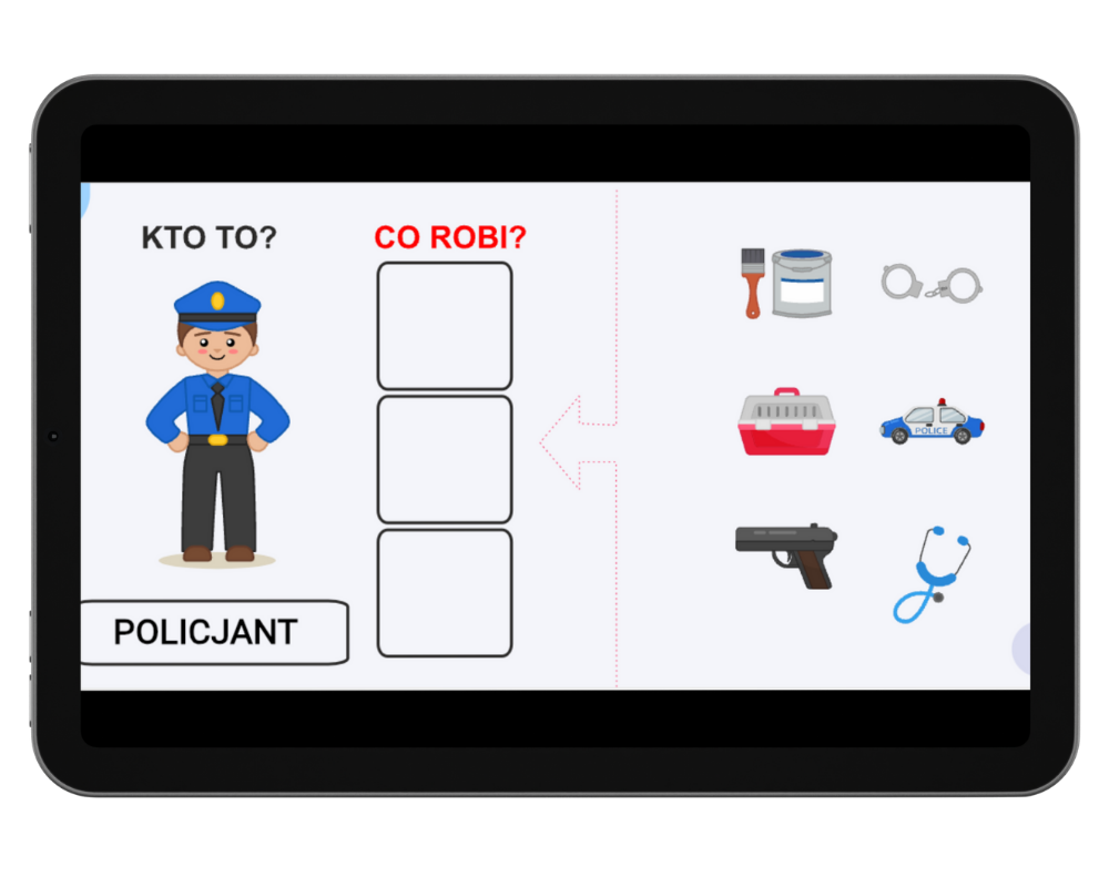 Poznajemy zawody to interaktywna gra edukacyjna, której celem jest zapoznanie dziecka z różnymi zawodami oraz charakterystycznymi dla nich atrybutami w przystępnej i angażującej formie zabawy. Podczas gry dziecko uczy się rozpoznawać i nazywać zawody, dopasowywać do nich odpowiednie atrybuty, a także poszerza swoje słownictwo i wiedzę o otaczającym świecie.