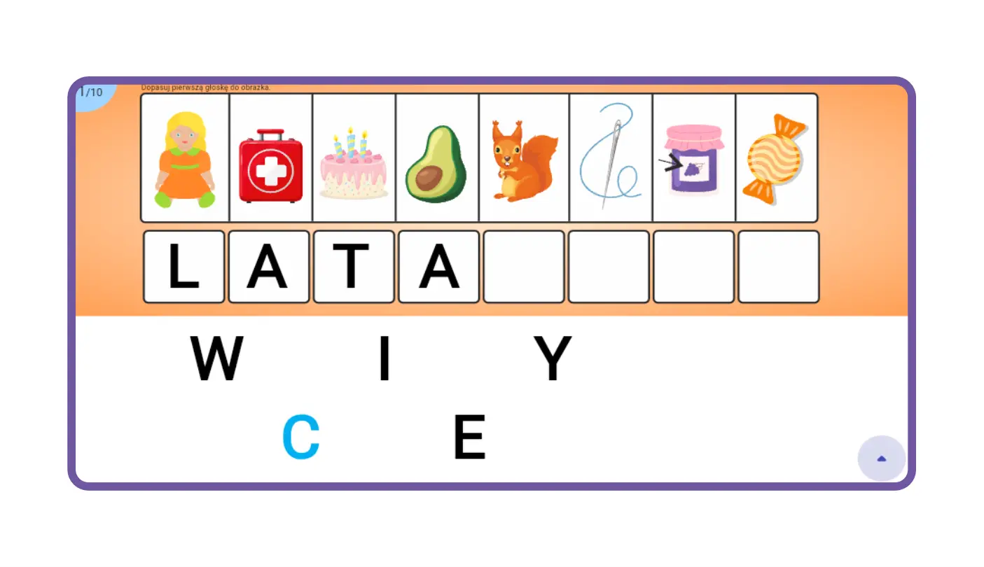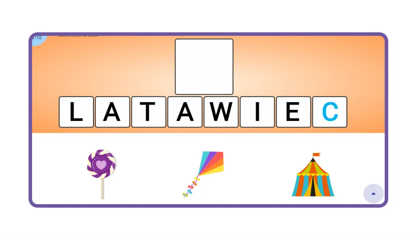 Tworzymy wyrazy głoski syczące to propozycja gry skupionej na poprawnej pisowni, rozpoznawaniu głosek oraz budowaniu wyrazów. Pomaga dziecku w rozpoznawaniu pierwszej usłyszanej głoski. Zadaniem dziecka jest wyodrębnienie pierwszej głoski z wyrazu na podstawie obrazka, a następnie złożenie ich w całość tworząc wyraz. Kolejnym etapem jest dobór odpowiedniego obrazka do wyrazu, a następnie zapamiętanie wyrazu i wybranie poprawnego zapisu.