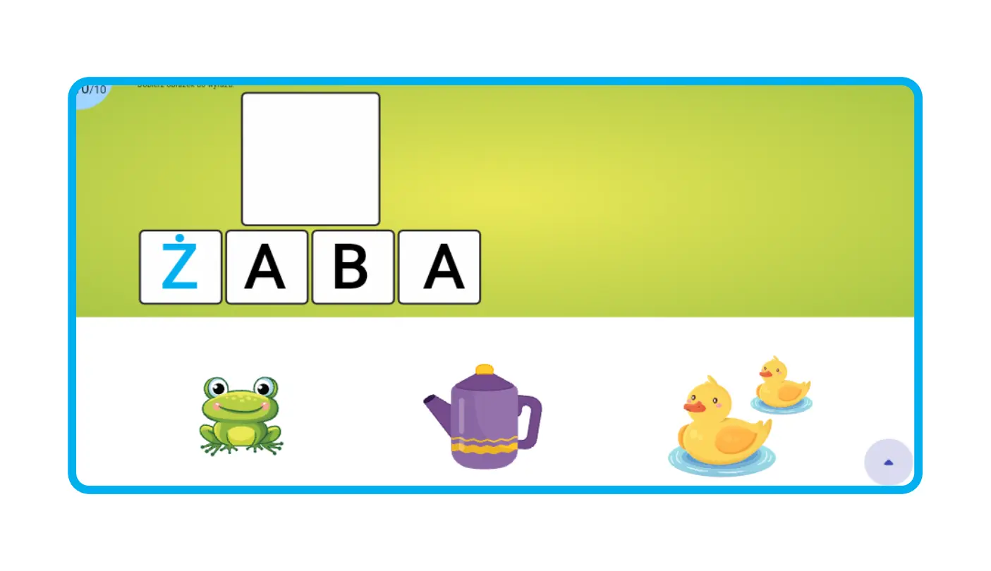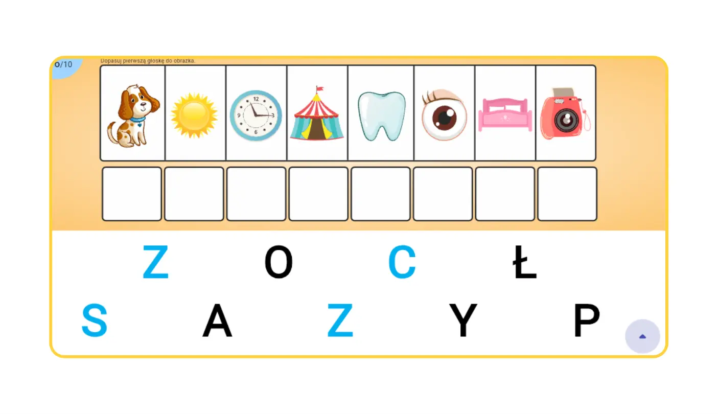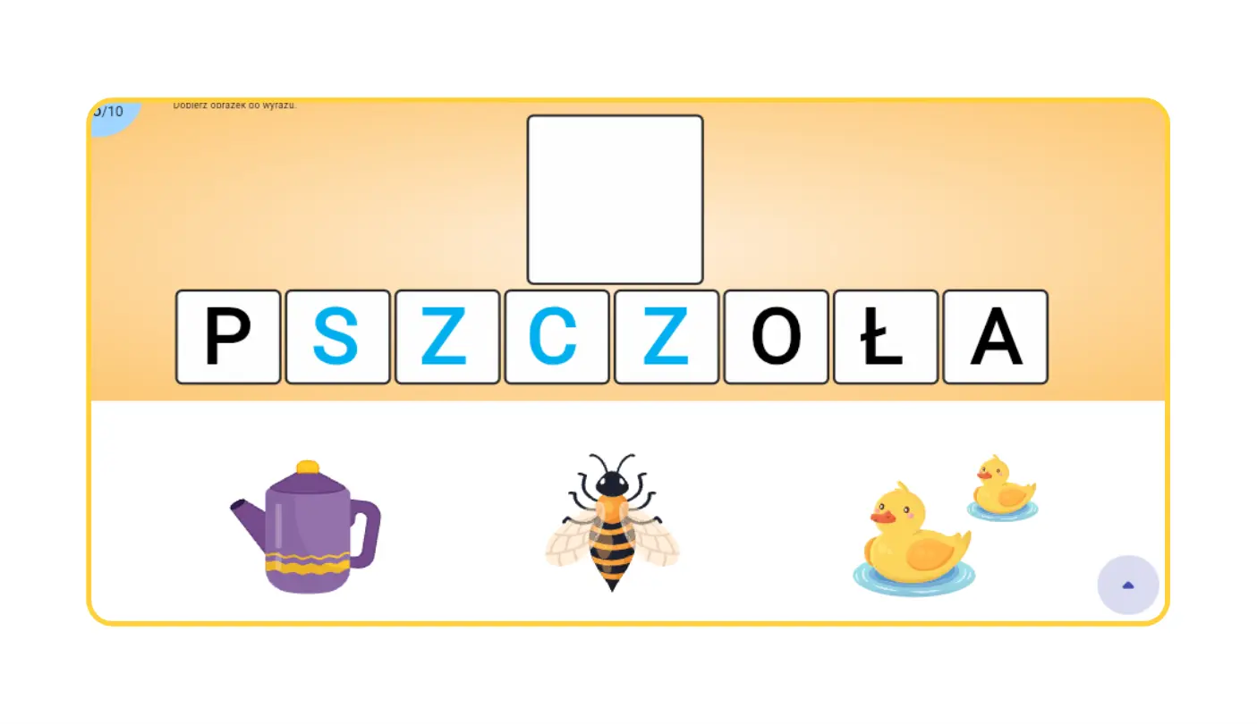 Tworzymy wyrazy głoski szumiące to propozycja gry skupionej na poprawnej pisowni, rozpoznawaniu głosek oraz budowaniu wyrazów. Pomaga dziecku w rozpoznawaniu pierwszej usłyszanej głoski. Zadaniem dziecka jest wyodrębnienie pierwszej głoski z wyrazu na podstawie obrazka, a następnie złożenie ich w całość tworząc wyraz. Kolejnym etapem jest dobór odpowiedniego obrazka do wyrazu, a następnie zapamiętanie wyrazu i wybranie poprawnego zapisu.